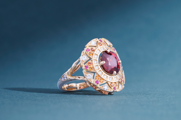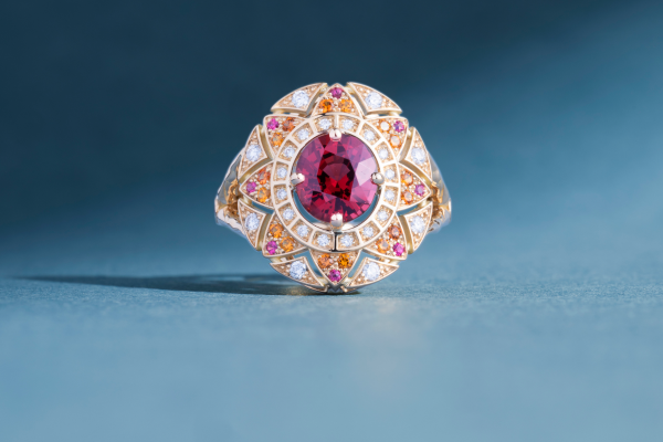 Le travail de l’Atelier commence après leur départ. Le centre sera un spinelle rouge orangé. Les motifs réguliers qui l’encerclent rappellent l’art primitif et si représentatifs des tribus de l’Est. Les empiècements se succèdent, ornés de couleurs chaudes, brûlantes même, rappelant celles de la braise rougeoyante d’une journée qui s’achève.